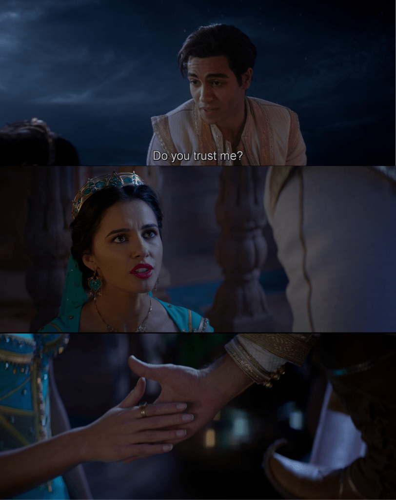 In Aladdin’s and Jasmine’s first encounter. When confronted by guards, Aladdin asks simply, “Do you trust me?” and reaches out his hand which she tentatively takes. A moment that sticks with her. And sticks with the audience. This is later mirrored in the film when Aladdin as Prince Ali invites Jasmine on a magic carpet ride. With outstretched hand, he once again asks her: “Do you trust me?” There is a moment of confusion for Jasmine, a jolt of deja vu, as she realizes who Prince Ali actually is. Simple storytelling in this story for children.