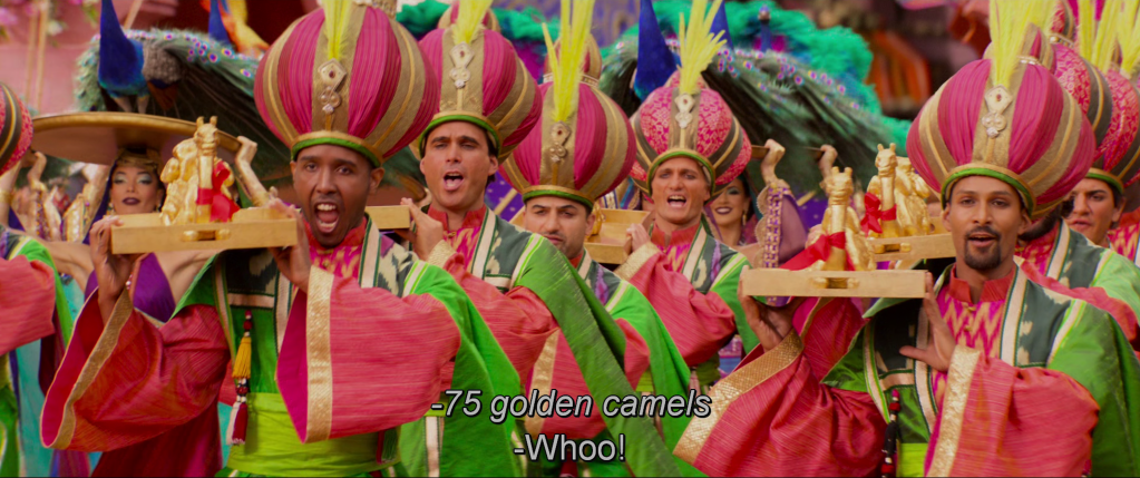 This movie had a budget of $183 million and this is the best they could do? Couldn’t spare a bit more resources to make these golden camels – and I must emphasis this point – that were conjured up by genie magic. Have them be ludicrously grandious. Why not have this be one part where they directly copy the original?