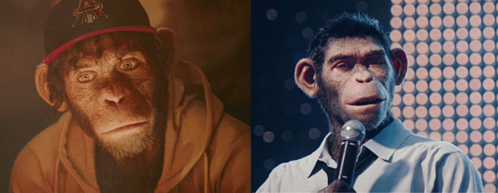 So, why is Robbie Williams a chimp? The choice seems only detrimental to the film. “Better Man” covers Robbie Williams’ rise to fame. Robbie Williams got famous quite young; chimpanzees have quite wrinkly faces. A-ha, a dilemma! Hard to see something so haggard looking (from a human perspective) seem young and youthful. The film tries its best to compensate, mostly via clothes and hair, but it is an uphill battle. Without going to Wikipedia, I would be hard-pressed to understand how much time has passed from his rise to fame in a boyband to the final concert at the end of the movie.